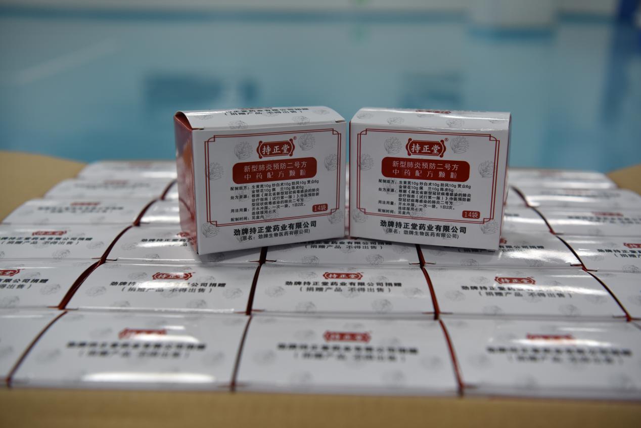 2月17日,劲牌3天赶制完成的2万副“肺炎1号”治疗中药配方颗粒免费送达全省50个治疗点。